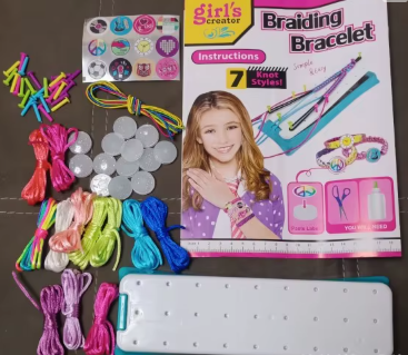 Inneholder fargede tråder, festemidler, anheng, flettbrett og guide, slik at barnet kan begynne umiddelbart, uten ekstra materiell.